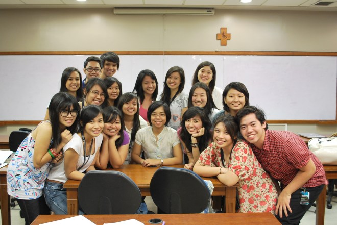 Ah yes, the class I most looked forward to, Marketing. Marketing was fun despite the difficult to do WACs and the bloody papers. Actually, having it at Friday night and Saturday morning wasn’t so bad after all considering a 6 hour break every Friday. I would really miss all the commercials that were shown and seriously, it really made me want to go to advertising after college, but I’m still open to anything. I can say that probably it took time before we got to really get to know our ME classmates compared to everyone else. The whole time we really thought they didn’t want to mingle but apparently some felt we were cliquish. HAHA! Sir Wilson Gan’s a really great cheerful guy and he provided us much assistance along the way in all of our papers and there’s improvement a. I will never forget this one 6-8PM class when we were just all so crazy and he didn’t mind at all! Sir Wilson, thank you for sticking with us despite our insanity π
