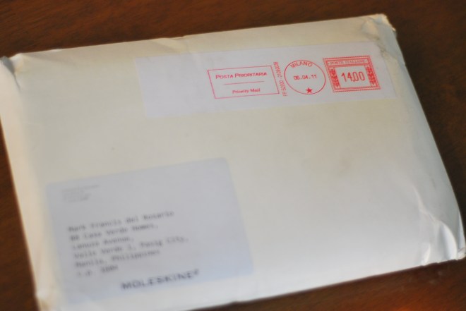 Well, I was just watching Paris, Je T’Aime and my mom suddenly gave me something she found on our doorsteps! To our surprise, it’s a package from Moleskine straight from Milan!